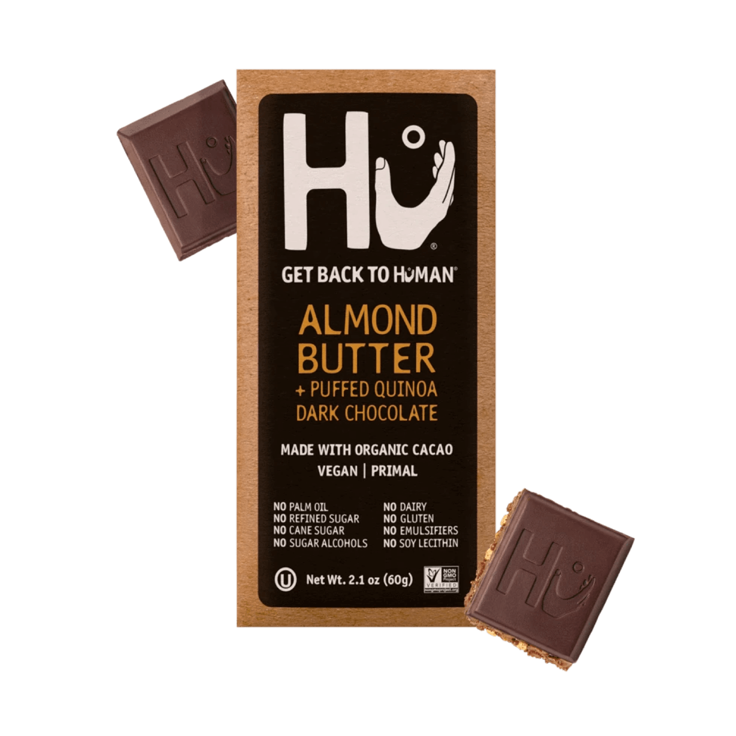 Fabriqué avec du chocolat noir, du beurre d'amande riche et du quinoa soufflé. Primal, végétalien et sans produits laitiers.
